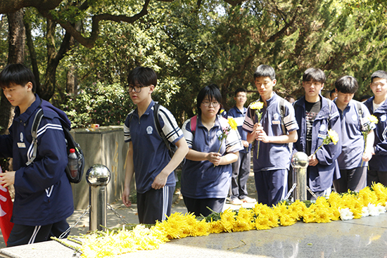 儀式尾聲,同學們手持菊花,有序環繞紀念碑緩步瞻仰,并輕輕將鮮花獻在碑前。一朵朵菊花,承載著無盡的追思,也象征著純潔與堅定。這不僅是對先烈的告別,更是奔赴未來的誓言。