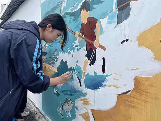 創作前,何劍偉老師深情講述了江東村的圍墾歷史,“敢教日月換新天”的奮斗精神深深感染了每一位學生。大家將圍墾文化元素融入墻繪——揮鍬挑土的農民、飄揚的紅旗、豐收的田野……一幕幕承載鄉土記憶的畫面在畫筆下鮮活起來,學生也在調色與勾勒之間厚植了家國情懷。