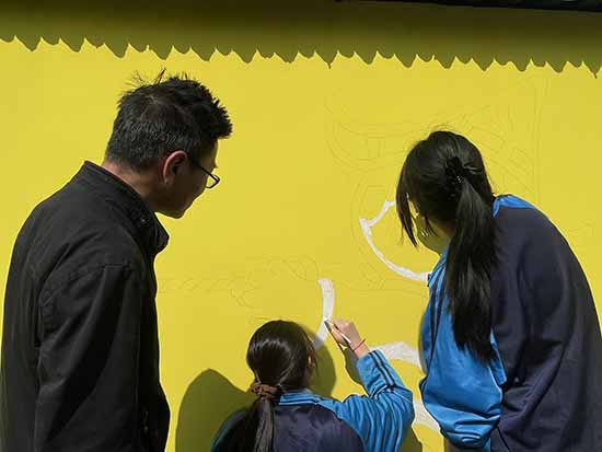 兩校教師帶頭策劃、悉心指導并親身實干,將專業優勢轉化為服務鄉村的文化動能。目前,村口以“圍墾記憶”為主題的主墻繪已完成底色鋪陳和主體輪廓,農民揮鍬挑土的場景初顯生動,師生們正利用課余時間分批進村細化完善。村民們路過時紛紛駐足,對即將完成的畫卷充滿期待。