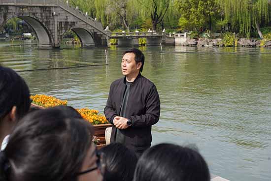 抵達(dá)南湖會(huì)景園內(nèi)的望湖廣場(chǎng),嚴(yán)葉偉現(xiàn)場(chǎng)講授一堂“微思政課”。他從嘉興獨(dú)有的“兩個(gè)文化”切入,將革命文化的紅船精神與歷史文化的江南文脈相融合,勉勵(lì)學(xué)生:“你們腳下的這片土地,既孕育了開(kāi)天辟地的革命火種,也積淀了千年的詩(shī)書(shū)風(fēng)雅。傳承好‘兩個(gè)文化’,是當(dāng)代青年的責(zé)任。”同學(xué)們凝神聆聽(tīng),并不時(shí)在學(xué)習(xí)單上記錄。這堂在湖畔開(kāi)講的思政課,沒(méi)有了圍墻的阻隔,卻多了幾分直抵人心的力量。